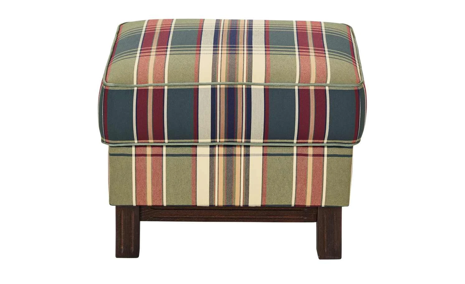 Ob alleinstehen oder in Kombination mit dem gleichnamigen Sessel – der Hocker Newport ist ein Highlight für jedes Zimmer. Newport ist komfortabel mit Kaltschaum und einer Wellenunterfederung gepolstert. Der Bezug besteht aus Polyester und ist im Karodesign gehalten. Die Farben des Karos reichen von Grün und Rot über Beige bis hin zu Blau. Der Keder, also die sogenannte Randverstärkung, ist ebenfalls grün. Newport steht auf vier verzierten Holzfüßen aus kastanienbrauner Buche.