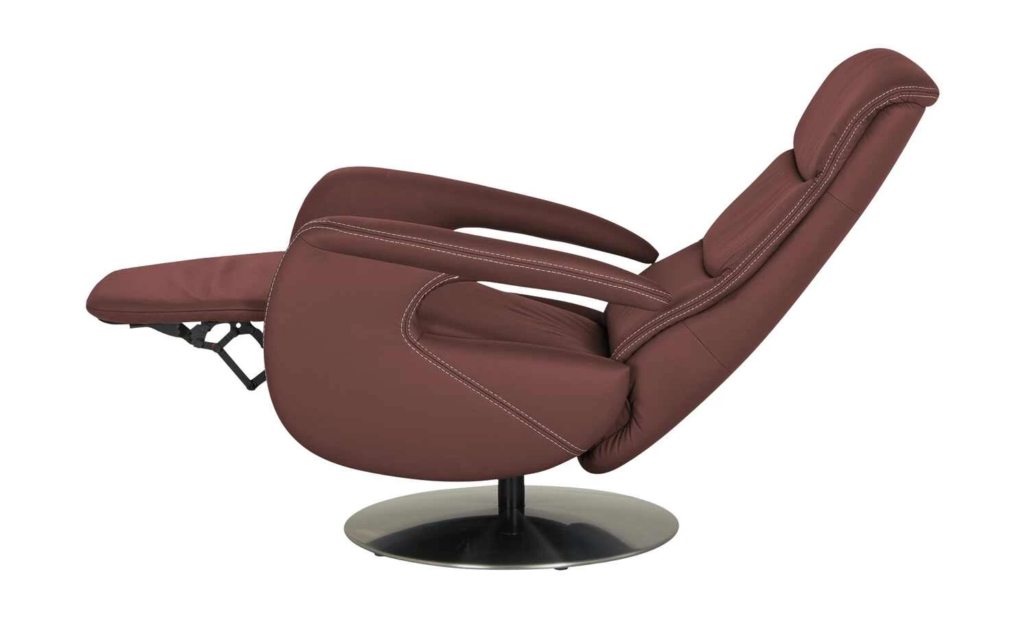 Der Ledersessel Franzi ist durch die dekorative Kontrastnaht und die modernen Armlehnen ein echter Blickfang in jedem Zimmer. Der Metalldrehteller in Edelstahl-Optik hebt sich gekonnt vom Leder ab. Beim Drehsessel Franzi dreht sich alles um Ihren Komfort: Durch die Gasdruckfeder ist das Verstellen der Rückenlehne kinderleicht. Das Fußteil reagiert auf Ihren Körperdruck. So haben Sie im Handumdrehen einen Ort zum Entspannen und Füße hochlegen. Die Wellenunterfederung und der hochwertige PUR-Schaum sorgen für langanhaltenden Sitzkomfort.