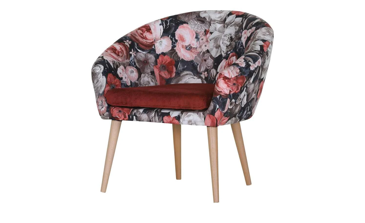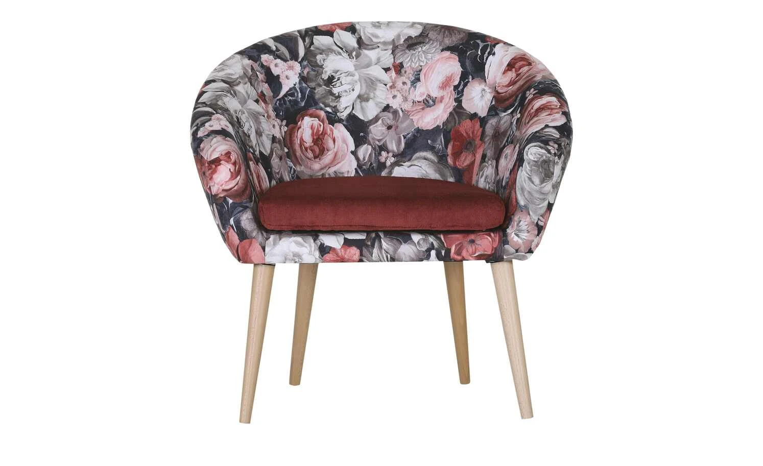 Mit seinem lebhaften Blumenprint zieht dieser Sessel garantiert die Blicke auf sich. Der schwarz grundierte Bezug ist komplett mit hellen Blüten bedruckt, die sich kontrastreich abheben. Ein rotes Stuhlkissen erhöht den Komfort im Sitzbereich. Die edle, frühlingshafte Sitzschale wird von Eichen-Massivholzfüßen getragen, die dem Sessel eine attraktive Scandi-Note verleihen.