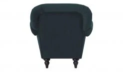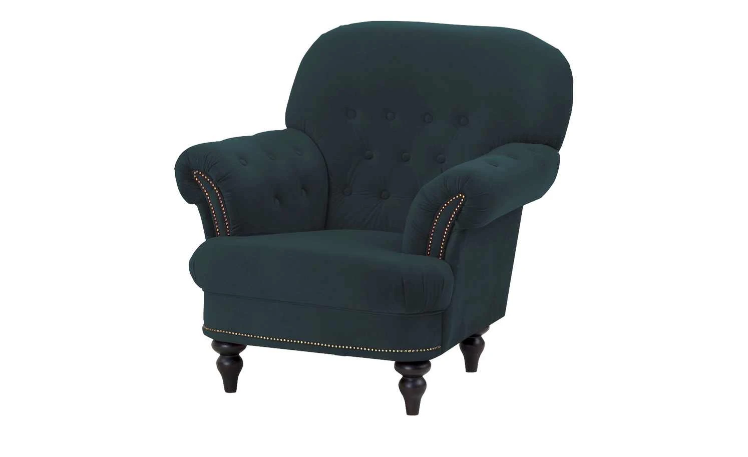 Der Sessel Sissi ist in seiner Gestaltung an den historischen Chesterfield-Stil angelehnt und strahlt Eleganz aus. Er ist an Armlehnen und Rückenlehne formschön abgesteppt und mit Zierknöpfen versehen. Weitere Akzente werden durch Metallnieten und die geschwundenen Holzfüße gesetzt. Diese sind aus massiver Kiefer und wengefarbig. Der dunkle Farbton passt gut zum Mikrofaserbezug. Dieser hat eine leicht samtige Optik, die zum Vintagestil des Sessels passt. Sitzbereich, Armlehnen sind weich gepolstert – der Sitzbereich außerdem mit einem Federkern ausgestattet.