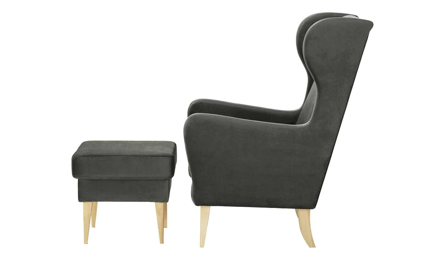 Elegant geschwungene Ohren und Armlehnen machen diesen Sessel zum einladenden Eyecatcher. Der samtig weiche Bezug aus pflegeleichtem Polyester betont das edle Erscheinungsbild gekonnt. Zusammen mit den hellen Massivholzfüßen aus Birkenholz entsteht ein Stil, der sich problemlos in zahlreiche Raumkonzepte integrieren lässt. Die hochwertige Schaumstoffpolsterung wird von einer Gurtfederung unterstützt, sodass für langanhaltenden Sitzkomfort gesorgt ist. Übrigens: Kombinieren Sie den Ohrensessel mit dem gleichnamigen Polsterhocker, um Ihre Füße nach einem langen Tag entspannt hochzulegen.