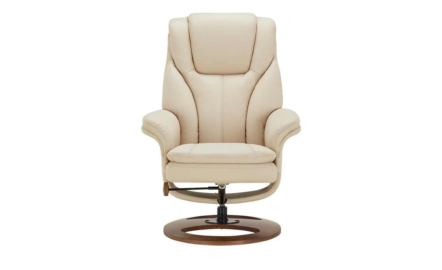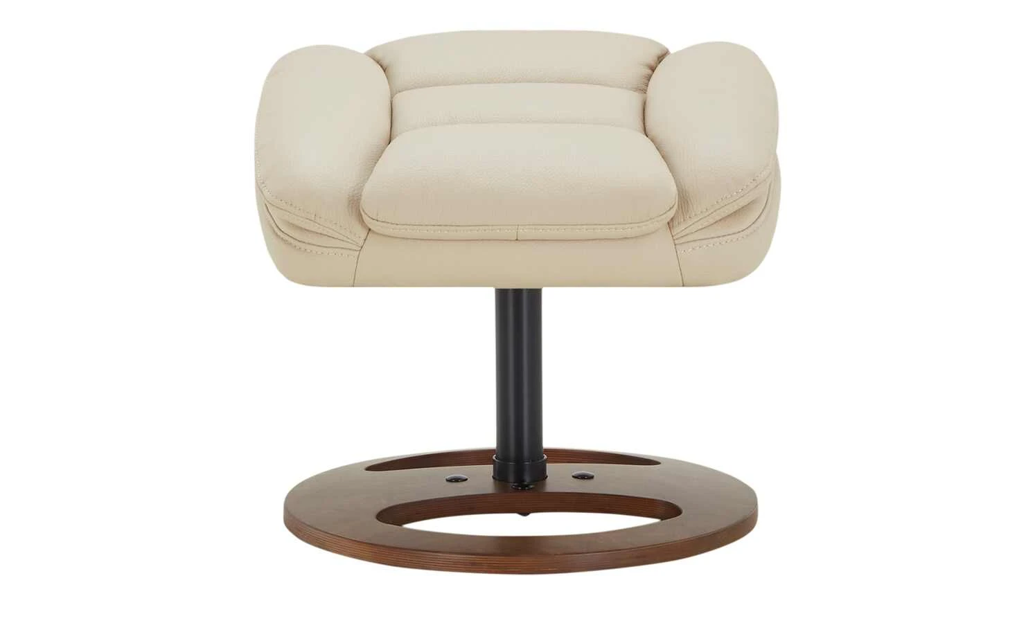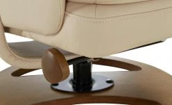 Lehnen Sie sich zurück und legen Sie die Füße hoch. Das Set Frieda lässt keine Wünsche offen. Der Relaxsessel mit hochwertiger Schaumstoffpolsterung besitzt eine gesteppte Rückenlehne und lädt zum Entspannen ein. Die Sitzposition lässt sich kinderleicht verstellen. Der Relaxsessel und der dazugehörige Hocker sind beide drehbar und mit einem cremefarbenen Kunstlederbezug bezogen. Eine dezente Doppelnaht verziert die beiden Polstermöbel. Besonders edel wirken die beiden Drehteller-Füße aus massivem, geöltem Birkenholz.